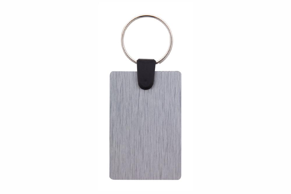 Négyzet formájú, szálcsiszolt alumínium szendvicslemezből készült kulcstartó, full colour emblémázással.